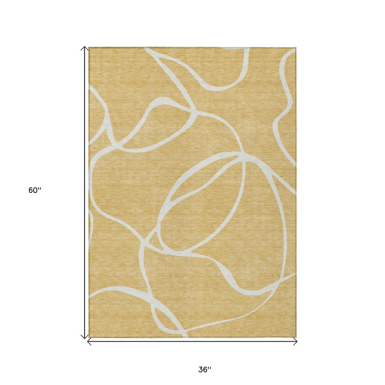 Add some artistry to your room with this 3-foot x 5-foot gold and ivory abstract washable indoor outdoor area rug. This rectangle shaped rug features a abstract design that will work well both indoors or out. A classic shape marries with good looking design for your living room, hall, bedroom, porch, patio, or poolside. Ideal for outdoor spaces or high traffic areas with kids and pets, this rug is made from heavy duty polyester that is stain resistant to help repel water, dirt, and stains. Makes a great way to dress up your patio, porch, or poolside, but also works well as a durable and easy to maintain option in the kitchen, family room, or mudroom. 36-inch h x 60-inch w x 0.19-inch d.