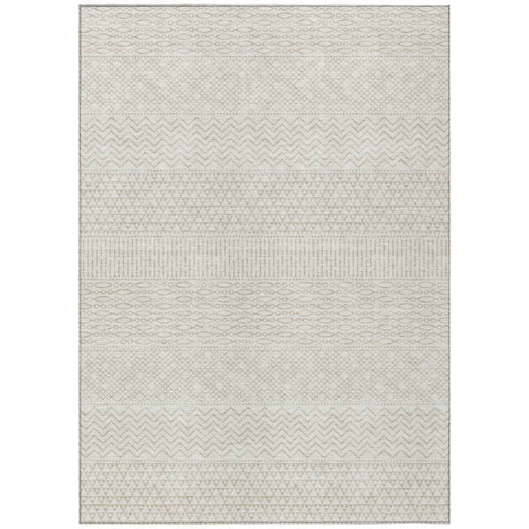 This 5-foot x 8-foot ivory and beige chevron washable indoor outdoor area rug, is a great way to add warmth to a room. This rectangle shaped rug features a chevron design that will work well both indoors or out. A classic shape marries with good looking design for your living room, hall, bedroom, porch, patio, or poolside. Ideal for outdoor spaces or high traffic areas with kids and pets, this rug is made from heavy duty polyester that is stain resistant to help repel water, dirt, and stains. Versatile in use, durable, and easy to maintain, this rug is an ideal solution to add a decorative and inviting touch to your indoor or outdoor space. 60-inch h x 90-inch w x 0.19-inch d.