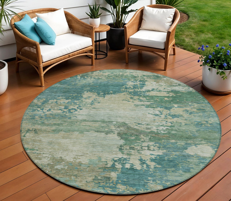 Set an inviting tone in your space with this 8-foot teal blue beige and denim blue round abstract washable indoor outdoor area rug. This geometric round shaped rug features a abstract pattern in teal blue, beige, and denim blue that combines a good looking print with a unique and updated shape. The mix of shape, color, and design gives this rug refreshing visual interest. Ideal for outdoor spaces or high traffic areas with kids and pets, this rug is made from heavy duty polyester that is stain resistant to help repel water, dirt, and stains. Makes a great way to dress up your patio, porch, or poolside, but also works well as a durable and easy to maintain option in the kitchen, family room, or mudroom. 96-inch h x 96-inch w x 0.19-inch d.