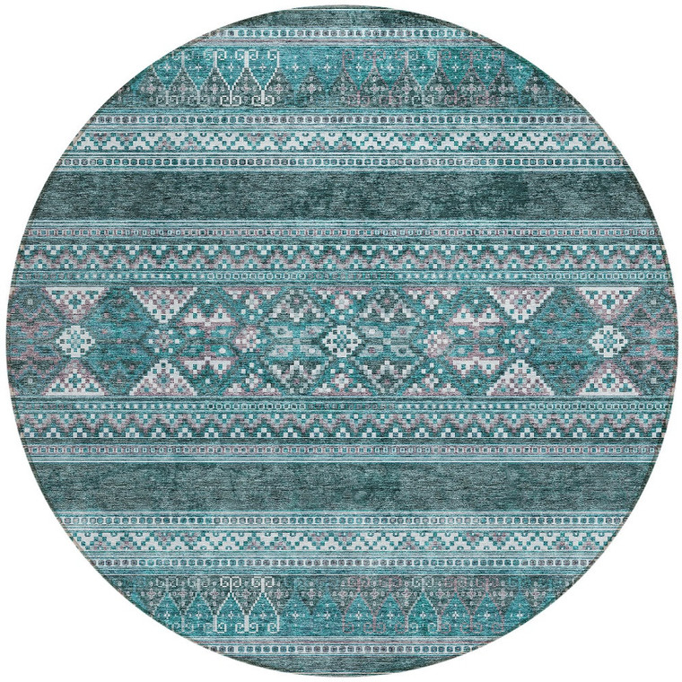 Set an inviting tone in your space with this 8-foot teal blue ivory and gray round southwestern washable indoor outdoor area rug. This geometric round shaped rug features a southwestern pattern in teal blue, ivory, and gray that combines a good looking print with a unique and updated shape. The mix of shape, color, and design gives this rug refreshing visual interest. Ideal for outdoor spaces or high traffic areas with kids and pets, this rug is made from heavy duty polyester that is stain resistant to help repel water, dirt, and stains. Makes a great way to dress up your patio, porch, or poolside, but also works well as a durable and easy to maintain option in the kitchen, family room, or mudroom. 96-inch h x 96-inch w x 0.19-inch d.