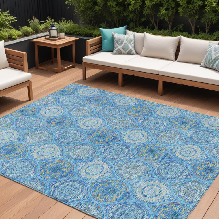 - Made from durable polyester, this rug features a beautiful denim blue, sky blue, and ivory color palette for a fresh and stylish outdoor look.