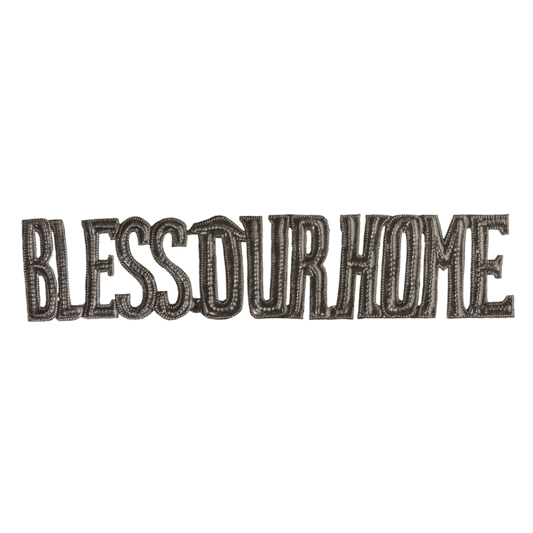 Perfect for home or garden, each Bless Our Home Sign is approximately 15" x 3.5" x 0.5" and hand-chiseled out of recycled steel oil drums by Haitian artisans using techniques first developed by Georges Liautaud in the late 1950s when he chalked out his first design on a flattened steel oil drum and then cut it out by hand with a mallet and chisel. As each piece is handmade, their final dimensions and finish may vary slightly.