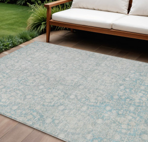 10' X 14' Aqua Blue And Silver Floral Washable Indoor Outdoor Area Rug